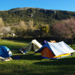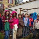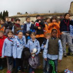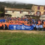 C’est ainsi que nous sommes plus de 400 à nous retrouver aux Courmettes pour le week-end de la fraternité. Le mauvais temps ne nous empêche pas de profiter des grands espaces de ce domaine, véritable balcon de la Côte d’Azur. Arrivés en milieu de journée, on commence par monter les tentes, du moins pour ceux qui dorment sous tente, car les plus jeunes dorment en dûr à l’abri du vent et du froid. L’après-midi, les jeunes sont regroupés en équipes mélangées: pas question de rester chacun de son côté ! Ce sont pas moins de 20 équipes qui se répartissent sur autant d’ateliers: jeu de connaissance du Scoutisme Français, jeux en plein air, services de nettoyage du terrain, ramassage de bois pour le feu… Une pause goûter et hop, on repart pour un grand jeu de troll-ball.